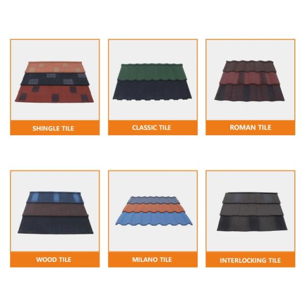 It is main trend of current trend of current international advanced roofing material.Stone-coated metal roofing tile uses Alu-zinc alloy steel with multiple protective films as the substrate, pressed under the mold with well-developed technology, combining with colorful basalt granules as the surface, to become the best roofing tile materials.